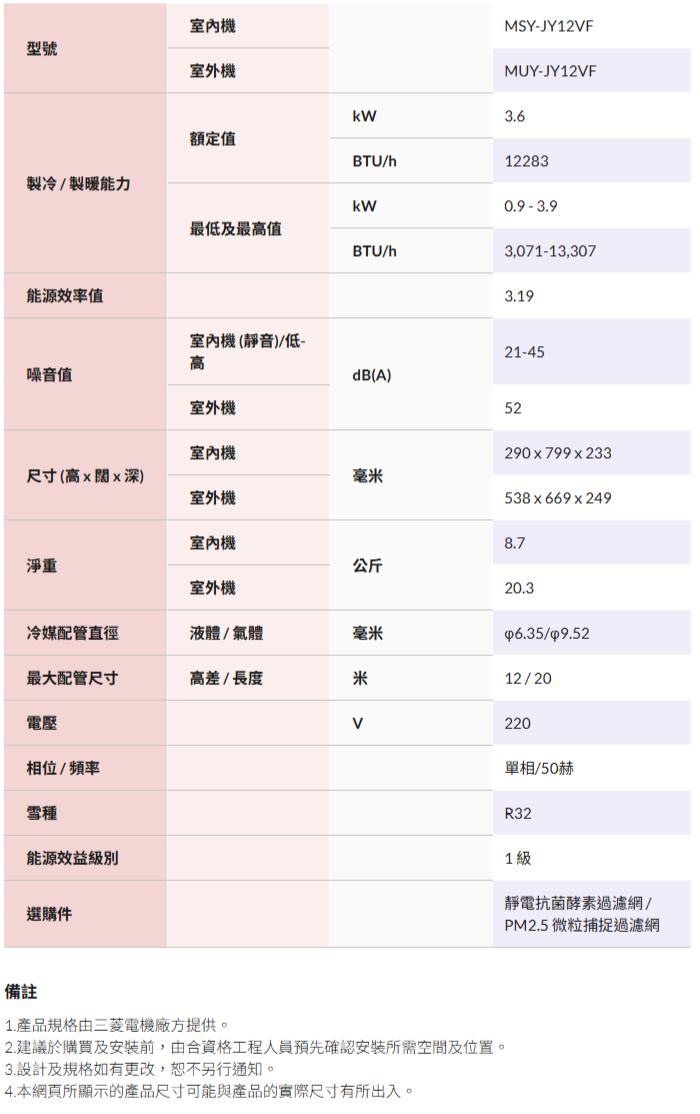 | 安裝款式 | 掛牆分體式冷氣機 |
