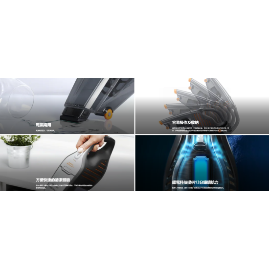 其他功能 鋰電科技提供13分鐘續航力,配備7.2V鋰電池,提供13分鐘(一般模式)及10分鐘(加強模式)的持續清潔能力