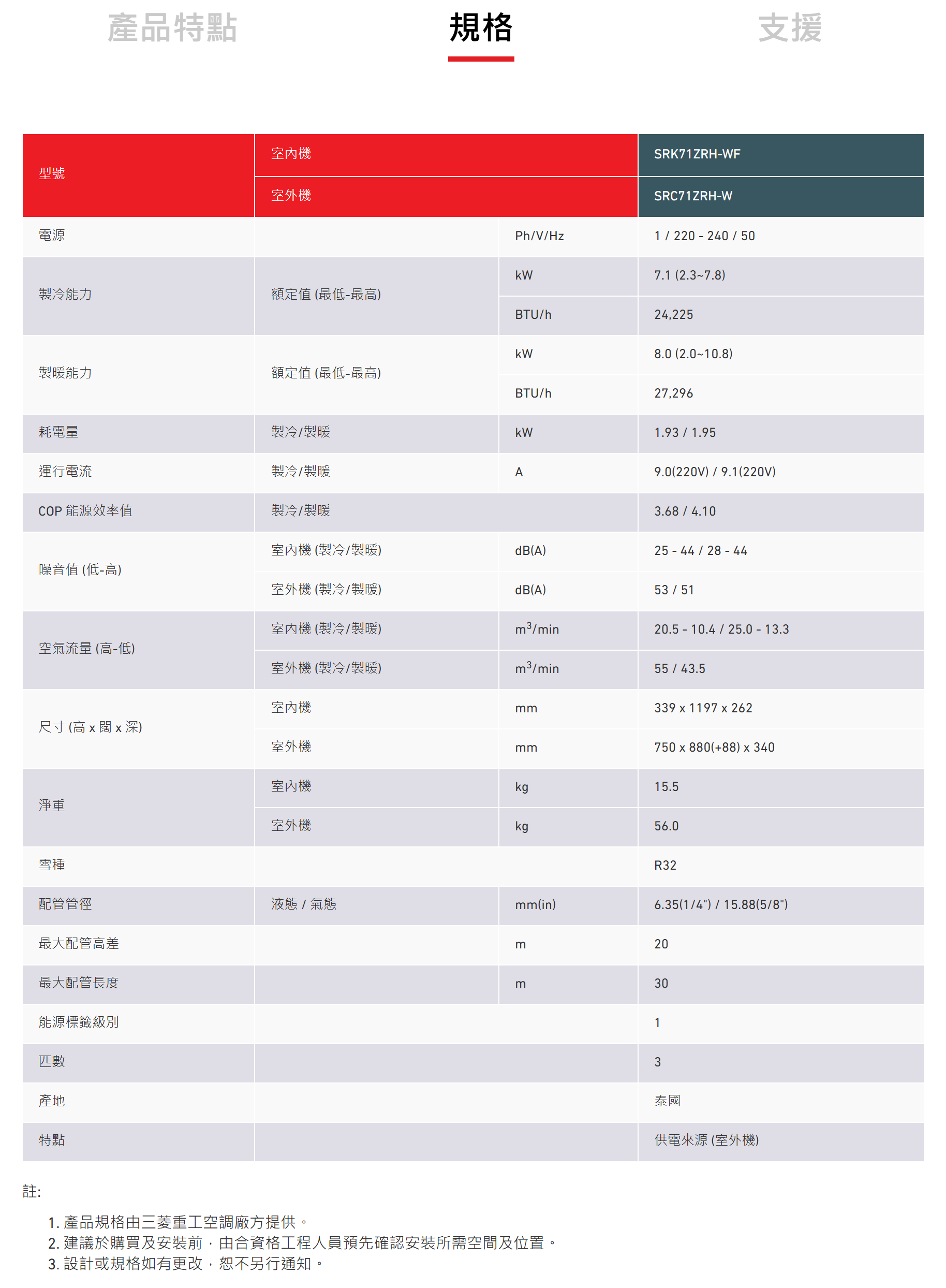 MITSUBISHI HEAVY INDUSTRIES 三菱重工 SRK71ZRHWF 三匹 變頻冷暖掛牆分體式冷氣機 (附遙控)